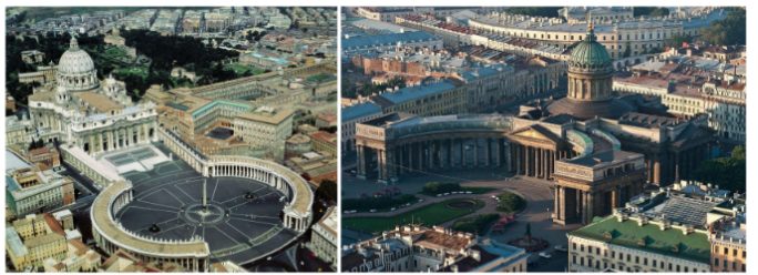 Задание 1. Известно, что император Павел I, объявляя конкурс на постройку Казанского собора, хотел, чтобы это здание напоминало собор Святого Петра в Риме. Архитектор А.Н. Воронихин смог авторски адаптировать элементы собора в Риме, чтобы проект пришелся по душе императору. Посмотрите на фотографии двух соборов и напишите, какие именно детали Воронихин «взял» у проекта Микеланджело и Бернини?