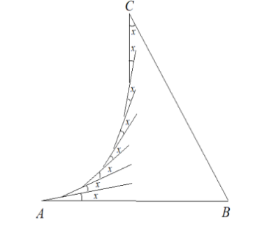 Задание 3. Дан ∠ABC= 60°. Из точки А внутри угла проведён луч, образующий с AB угол в x градусов. Из некоторой точки этого луча снова проведён луч, также образующий с первым лучом угол в x градусов. И так далее. Всего аналогичным образом было построено 7 лучей (смотри рисунок). Оказалось, что седьмой луч проходит через точку С и образует с ВС угол в x градусов. Найдите 𝑥 (в градусах).