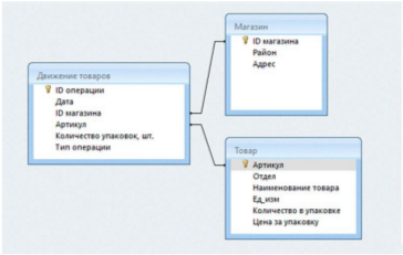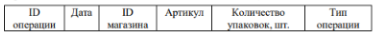 Таблица «Движение товаров» содержит записи о поставках товаров в магазины в течение августа 2023 г., а также информацию о проданных товарах. Поле Тип операции содержит значение Поступление или Продажа, а в соответствующее поле Количество упаковок, шт. внесена информация о том, сколько упаковок товара поступило в магазин или было продано в течение дня. Заголовок таблицы имеет следующий вид.