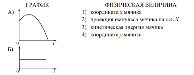 Графики А) и Б) представляют собой зависимости физических величин, характеризующих движение мячика в процессе полёта, от времени t. К каждой позиции первого столбца подберите соответствующую позицию из второго столбца и запишите в таблицу выбранные цифры под соответствующими буквами.