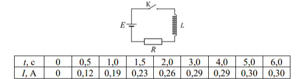Задание 14. Катушка индуктивности подключена к источнику тока с пренебрежимо малым внутренним сопротивлением через резистор с сопротивлением R = 80 Ом (см. рисунок). В момент t = 0 с ключ К замыкают. Значения силы тока I в цепи, измеренные в последовательные моменты времени, представлены в таблице.