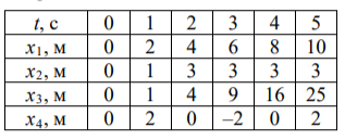 Задание 5. Четыре одинаковых тела малых размеров двигались вдоль оси OX. Масса каждого тела равна 80 г. В таблице представлены зависимости координат этих тел от времени t.