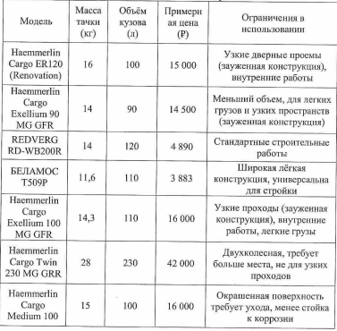 Таблица 1. Сравнительная таблица строительных тачек