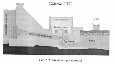 реку, чтобы поднять уровень воды, с которого может осуществляться её падение, необходимое для развития движущей силы. Проточная вода поворачивает колесо турбины, которое соединено с генератором. Генератор имеет ротор, который вращает турбина. При повороте ротора генератора производится электричество.