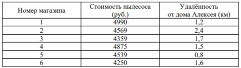 Задание 6. Алексею нужен пылесос. В таблице показано 6 предложений от разных магазинов и их удалённость от дома Алексея.