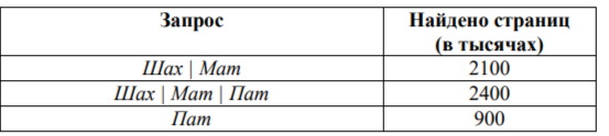 Какое количество страниц (в тысячах) будет найдено по запросу (Шах | Мат) & Пат? Считается, что все запросы выполнялись практически одновременно, так что набор страниц, содержащих все искомые слова, не изменялся за время выполнения запросов.