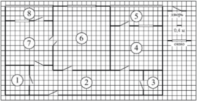 На рисунке изображён план двухкомнатной квартиры в многоэтажном жилом доме. Сторона одной клетки на плане соответствует 0,4 м, а условные обозначения двери и окна приведены в правой части рисунка.