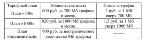 Задание 5. В квартире планируется подключить интернет. Предполагается, что трафик составит 750 Мб в месяц, и исходя из этого выбирается наиболее дешёвый вариант. Интернет-провайдер предлагает три тарифных плана. Сколько рублей нужно будет заплатить за месяц, если трафик действительно будет равен 750 Мб?