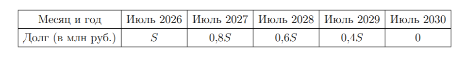 Задание 16. В июле 2026 года планируется взять кредит в банке на четыре года в размере S млн рублей, где S — целое число. Условия его возврата таковы: – каждый январь долг увеличивается на 25% по сравнению с концом предыдущего года; – с февраля по июнь каждого года необходимо одним платежом выплатить часть долга; – в июле каждого года долг должен составлять часть кредита в соответствии со следующей таблицей.