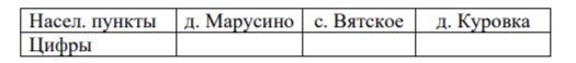 Задание 1. Пользуясь описанием, определите, какими цифрами на плане обозначены населённые пункты. Заполните таблицу, в бланк ответов перенесите последовательность трёх цифр без пробелов, запятых и других дополнительных символов.