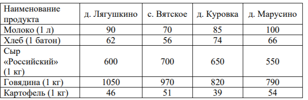 Задание 5. В таблице указана стоимость (в рублях) некоторых продуктов в четырёх магазинах, расположенных в деревне Лягушкино, селе Вятском, деревне Куровке и деревне Марусино.