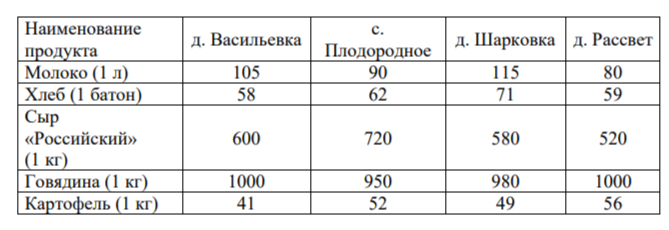 Задание 5. В таблице указана стоимость (в рублях) некоторых продуктов в четырёх магазинах, расположенных в деревне Васильевке, селе Плодородном, деревне Шарковке и деревне Рассвет.