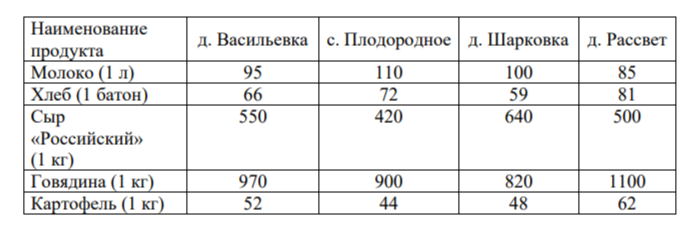 Задание 5. В таблице указана стоимость (в рублях) некоторых продуктов в четырёх магазинах, расположенных в деревне Васильевке, селе Плодородном, деревне Шарковке и деревне Рассвет.