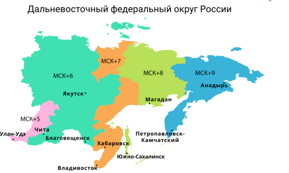 Задание 3. В самом большом федеральном округе России – Дальневосточном – целых 5 часовых поясов. Артём летит вечерним рейсом на самолёте из Магадана в Москву. В какой-то момент пилот объявил, что до посадки осталось ровно 3 часа. Тогда Артём посмотрел на свои часы, которые ещё не успел перевести на московское время. Во сколько по московскому времени пилот планирует совершить посадку? Воспользуйтесь картой часовых поясов Дальневосточного федерального округа России.