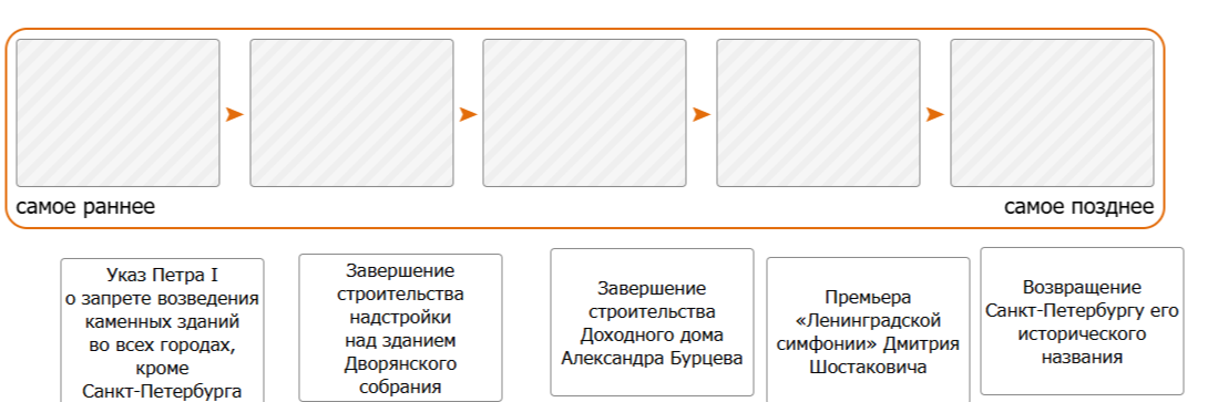 Задание 10. На основе информации из текстов 1 и 2 расположите события из предложенного списка, связанные с историей Санкт-Петербурга, в соответствующем порядке: от самого раннего к самому позднему.
