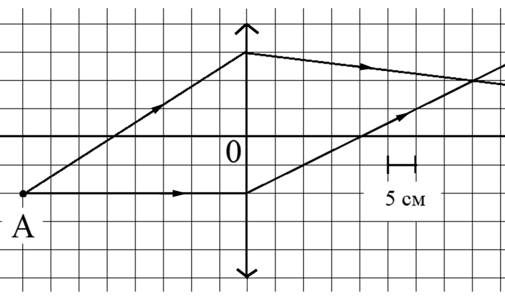 Задание 10. На рисунке показаны оптический центр и оптическая ось собирающей линзы, а также ход двух лучей от светящейся точки А.
