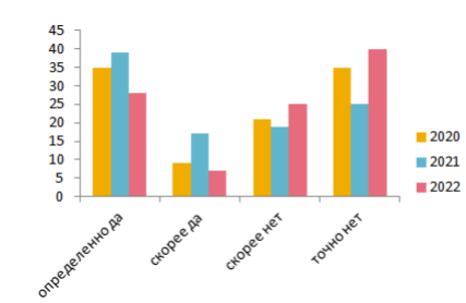 Задание 12. В городе N в течение трёх лет проводился опрос среди населения. Граждан просили ответить на вопрос «Довольны ли Вы реализацией программы «Реконструкция городских парков»?». Результаты опроса (в % от числа отвечавших) представлены на гистограмме.