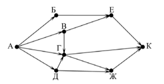 Задание 9. На рисунке – схема дорог, связывающих города А, Б, В, Г, Д, Е, Ж и К. По каждой дороге можно двигаться только в одном направлении, указанном стрелкой. Сколько существует различных путей из города А в город К, не проходящих через город Б?