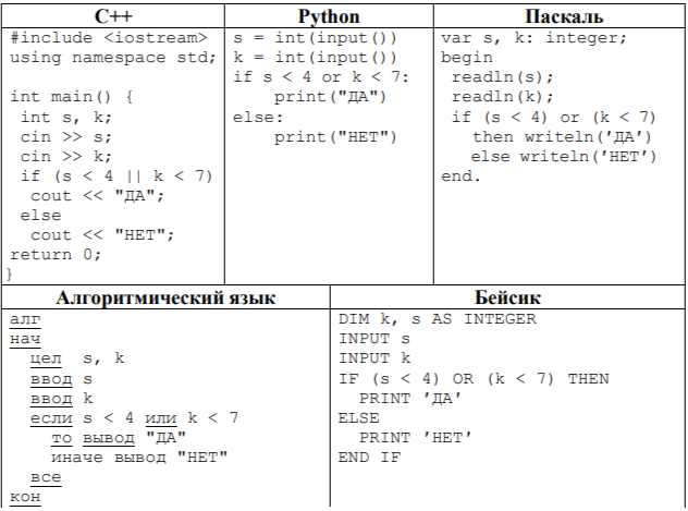Было проведено 9 запусков программы, при которых в качестве значений переменных вводились следующие пары чисел (s, k): (3, 6); (6, 3); (–3, 3); (3, –3); (–10, –10); (10, 10); (–7, 7); (8, –10); (5, 8). Сколько было запусков, при которых программа напечатала «НЕТ»?