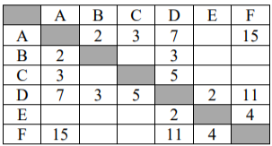 Задание 4. Между населёнными пунктами A, B, C, D, E, F построены дороги, протяжённость которых (в километрах) приведена в таблице.