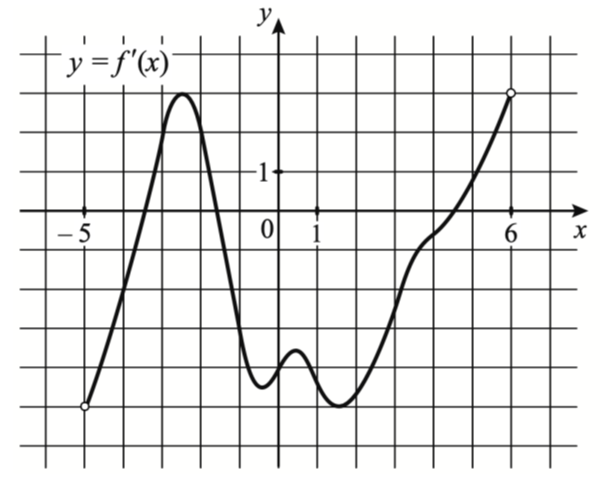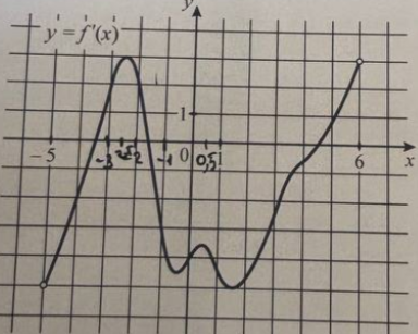 Задание 8. На рисунке изображён график y = f'(x) — производной функции f(x), определённой на интервале (-5; 6). Найдите промежутки возрастания функции f(x). В ответе укажите сумму целых точек, принадлежащих этим промежуткам.