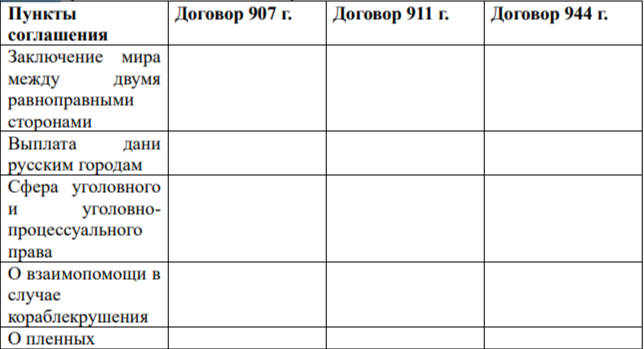 Задание 1. Система договоров X века заложила основы международно правовых отношений Руси. Договоры с Византийской империей стали важным фактором развития древнерусской государственности. Их влияние проявилось в правовой системе, экономике и дипломатии. Определите основные пункты соглашений в первой половины X в., отметив знаками» «+» или «-»