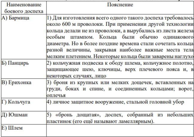 Задание 3.Для средневековой Руси, по словам Б. Д. Грекова, война являлась «главным средством разрешения стоящих перед ней задач». Соотнесите, к каким видам доспехов относятся их наименования, обратите внимание название доспехов больше, чем их объяснений.