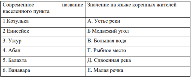 Задание 1. Изучение истории малой родины помогает нам понять себя, осознать свою роль в истории и обществе, а также ценить и сохранять наследие предыдущих поколений. Вам представлено современное название населенных пунктов и их значение на языке коренных жителей, населявших наш край на протяжении многих веков. Соотнесите название и значение на языке коренного народа