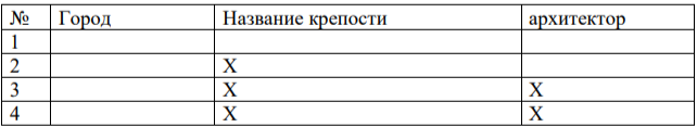 Задание 2. Крепости были ключевыми элементами в территориальном расширении и защите России, служа для обороны, контроля над торговыми путями и административного управления новыми землями. Перед вами изображения крепостей Российского государства. Заполните таблицу с указанием города, названием крепости, архитектора. Ячейки таблицы, не требующие заполнения отмечены знаком «Х».