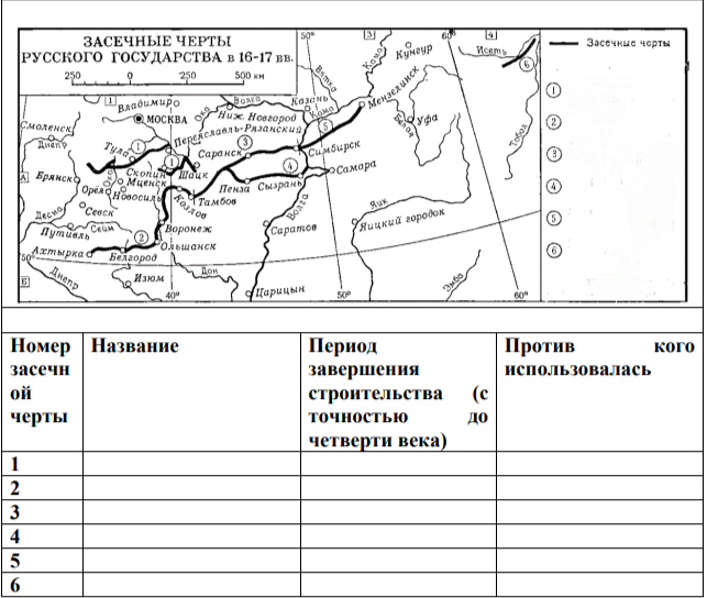 Задание 3. Историческая карта является важным инструментом в деятельности историка, так как она помогает в локализации исторических событий и явлений, а также в их систематизации. Проанализируйте историческую карту «Засечные черты русского государства в XYI-XYII вв. Определите название засечных полос в соответствии с номером на карте, время завершения строительства и против кого использованы были эти засечные черты.