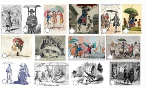 Авторы каких гравюр скептически относятся к зонту как к средству защиты в непогоду? В ответе на этот вопрос НЕ учитывайте иллюстрации с изображением Хенвея. Выберите не более трёх изображений.