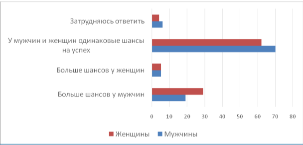 1) Свыше половины опрошенных в обеих группах указали, что у мужчин и женщин одинаковые шансы на успех.