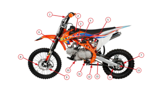 Задание 10. Соотнесите части левой стороны питбайка ATAKI под № 1, 4, 6, 8 с их обозначением.