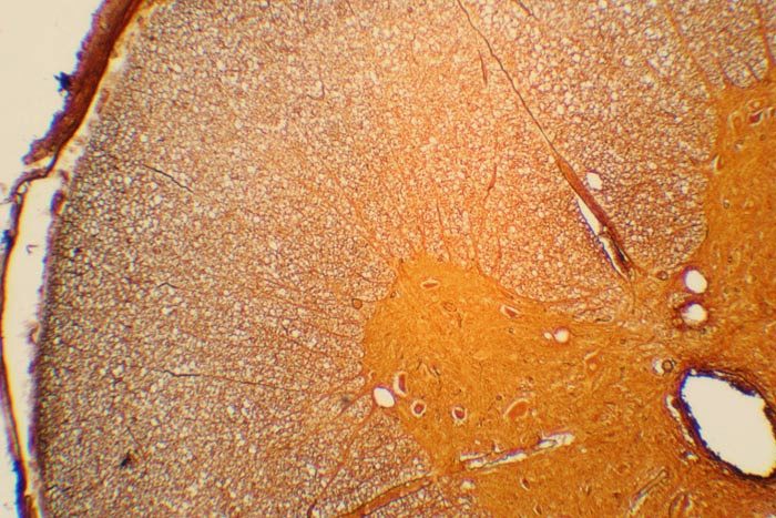 Задание 3. На занятии ребята рассматривали под микроскопом микропрепарат. Данияр предположил, что данная ткань обладает выраженной клеточной организацией, Андрей сказал, что на препарате виден центральный канал, вокруг которого располагается серое вещество. Лена отметила, что белое вещество расположено в центре в форме бабочки и cодержит тела нейронов и дендриты, а Яна считает, что белое вещество, занимающее большую часть объёма препарата, состоит из отростков нейронов и образует проводящие пути.