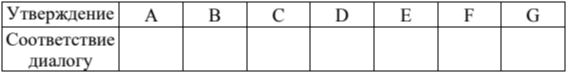 Задание 2. Вы услышите диалог. Определите, какие из приведённых утверждений А–G соответствуют содержанию текста (1 – True), какие не соответствуют (2 – False) и о чём в тексте не сказано, то есть на основании текста нельзя дать ни положительного, ни отрицательного ответа (3 – Not stated). Занесите номер выбранного Вами варианта ответа в таблицу. Вы услышите запись дважды.