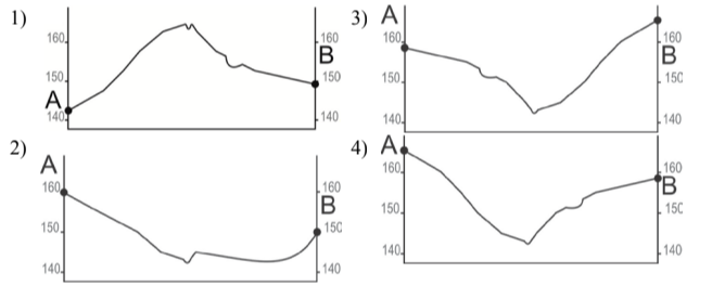 Задание 11. На рисунках представлены варианты профиля рельефа местности, построенные на основе карты по линии А – В разными учащимися. Какой из профилей построен верно?