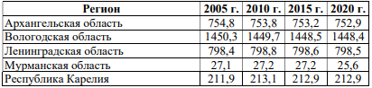 В таблице показаны данные о площадях сельскохозяйственных угодий (в тыс. га) в нескольких регионах Северо-Западного федерального округа.
