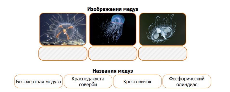 Задание 2. На основе информации из текста 1, текста 2 (таблицы) и текста 3 разместите таблички с названиями под аквариумами с медузами.