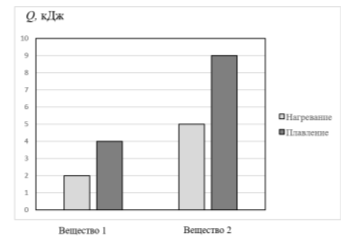 Задание 8. На диаграмме для двух веществ приведены значения количества теплоты, необходимого для нагревания 1 кг вещества на 10°C и для плавления 100 г вещества, нагретого до температуры плавления. (Схематичный рисунок диаграммы с подписями «Вещество 1» и «Вещество 2» по осям «Нагревание» и «Плавление»). Найдите отношение удельной теплоты плавления второго вещества λ₂ к удельной теплоте плавления первого вещества λ₁.