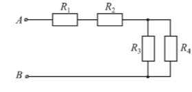 (Схема: Точки A и B. От A к цепи идет провод, далее резистор R₁, затем узел. От узла одна ветвь идет через резистор R₂ к точке B. Другая ветвь от узла идет через последовательно соединенные R₃ и R₄ к точке B).