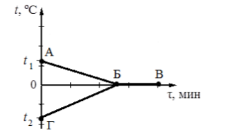 Задание 14. В калориметр с водой, находящейся при температуре t₁, добавили лёд, имевший температуру t₂ < 0°C. На рисунке представлены графики зависимости температуры от времени для воды и льда в калориметре. Теплообмен с окружающей средой пренебрежимо мал. (Описание графика: Ось Y — температура, ось X — время. Два графика: для воды (нисходящий) и для льда (восходящий). Отмечены точки и участки: А, Б, В, Г. Участок АБ для воды, БВ — горизонтальный участок для обоих, после В — восходящий для обоих).