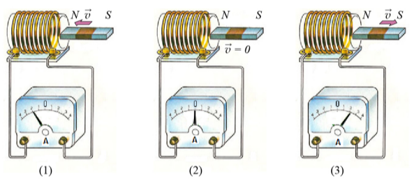 Задание 16. Используя катушку, замкнутую на амперметр, и полосовой магнит, ученик изучал явление электромагнитной индукции. На рисунке представлены результаты опыта для случая внесения магнита в катушку (1), для случая покоящегося магнита (2) и для случая вынесения магнита из катушки (3). Скорость движения магнита в опытах (1) и (3) одинаковая. (Рисунки: (1) Манит вносится в катушку, стрелка амперметра отклонена вправо. (2) Магнит покоится в катушке, стрелка амперметра на нуле. (3) Магнит выносится из катушки, стрелка амперметра отклонена влево).