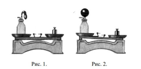 На весах уравновешена бутылка, в которой находится сжатый воздух. Через пробку бутылки пропущена стеклянная трубка с краном, на наружном конце которой привязана оболочка резинового шара (рисунок 1). Если открыть кран, то часть воздуха перейдёт в оболочку шара и раздует её. Равновесие весов при этом нарушится (рисунок 2), уравновешивающая гирька на правой чашке весов (А) .