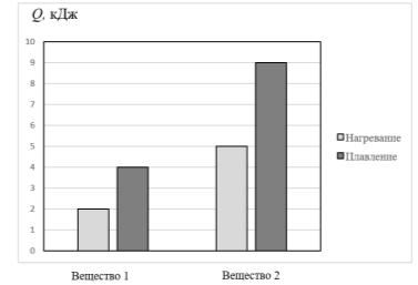 Задание 8. На диаграмме для двух веществ приведены значения количества теплоты, необходимого для нагревания 1 кг вещества на 10°С и для плавления 100 г вещества, нагретого до температуры плавления. (Диаграмма аналогична заданию 8 варианта 1). Найдите отношение количеств теплоты Q₂/Q₁, необходимых для нагревания 1 кг соответственно второго и первого веществ на 10 °С.