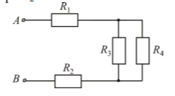 Задание 9. Участок электрической цепи, схема которой показана на рисунке, подключён к источнику постоянного напряжения U_AB = 6 В. Сопротивления резисторов R₁ = 5 Ом, R₂ = 4 Ом, R₃ = R₄ = 6 Ом. Найдите силу электрического тока, протекающего в резисторе R₂. (Схема аналогична заданию 9 варианта 1).
