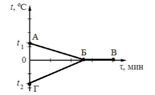 Задание 14. В калориметр с водой, находящейся при температуре t₁, добавили лёд, имевший температуру t₂ < 0°C. На рисунке представлены графики зависимости температуры от времени для воды и льда в калориметре. Теплообмен с окружающей средой пренебрежимо мал.