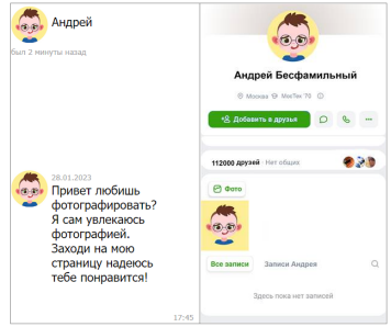 5. Егор получил личное сообщение в социальной сети от незнакомого человека по имени Андрей и перешёл на его страницу.
