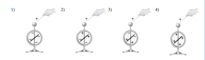 Задание 1. К незаряженному электрометру поднесли, не касаясь, положительно заряженную палочку. На каком рисунке правильно показано распределение заряда в электрометре?