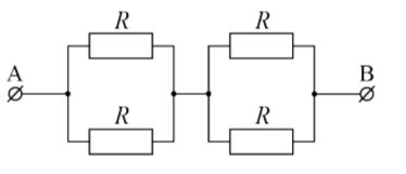 Задание 4. Ученик соединил четыре одинаковых резистора так, как показано на рисунке. Определите сопротивление цепи между точками А и В, если сопротивление одного резистора равно 14 Ом.