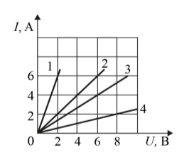 Задание 5. На рисунке представлен график зависимости силы тока I в проводниках от напряжения U на их концах. Какой проводник (1, 2, 3, 4) имеет сопротивление, равное 1 Ом?